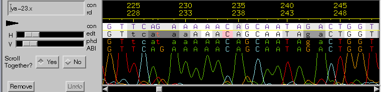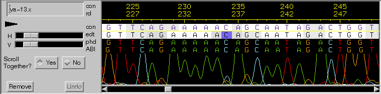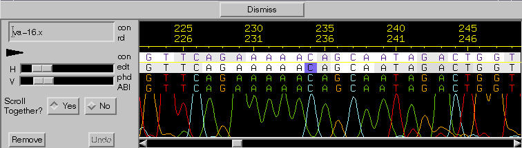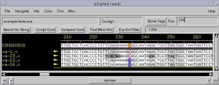 A Consed window with heterozygous single nucleotide substitution (position 234 (rank2, orange color) identified and tagged for review