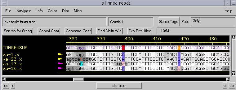A Consed window with heterozygous single nucleotide substittuion (position 398 (rank1, red color) identified and tagged for review