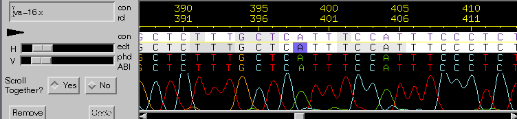 A heterozygote correctly identified by PolyPhred at position 398 with rank1.